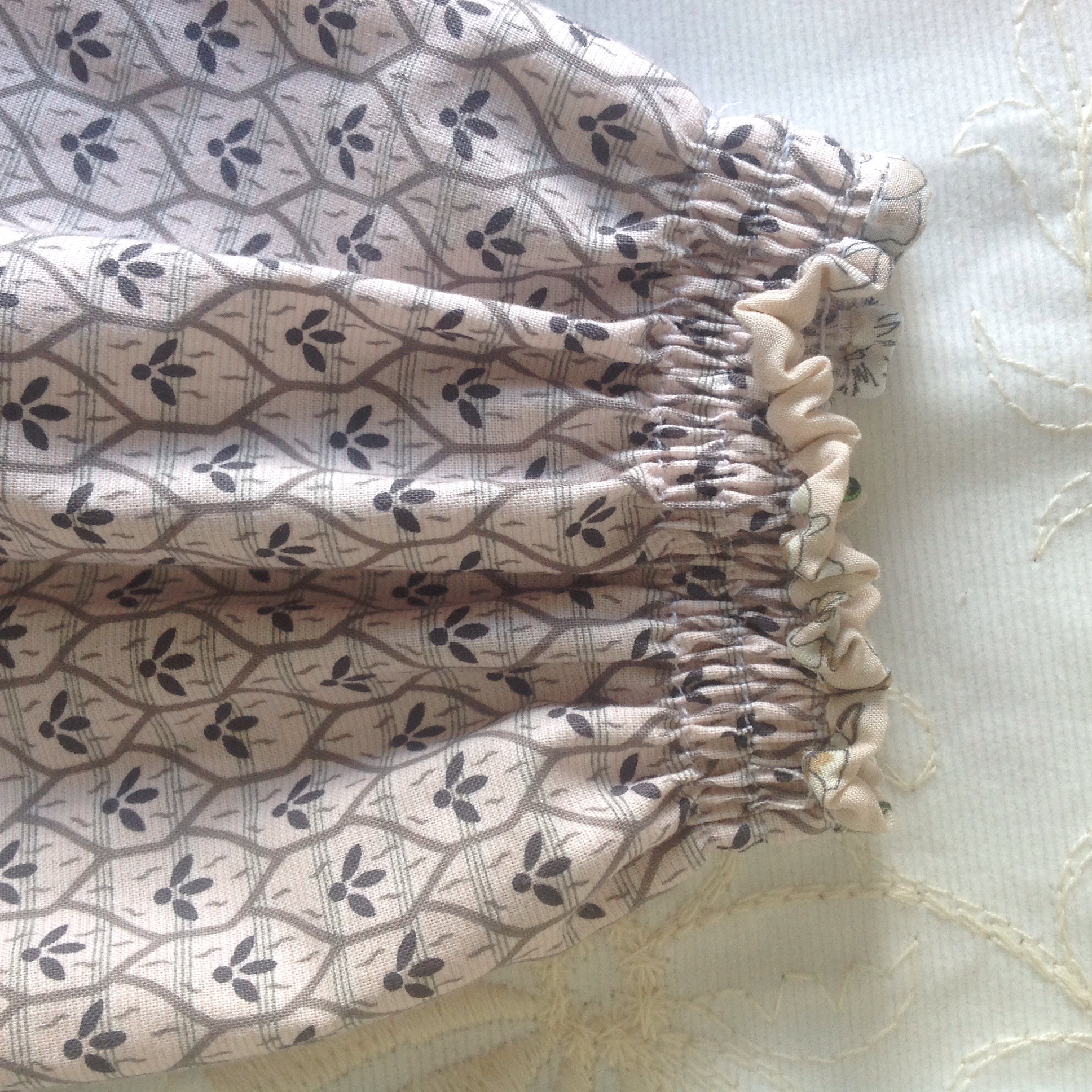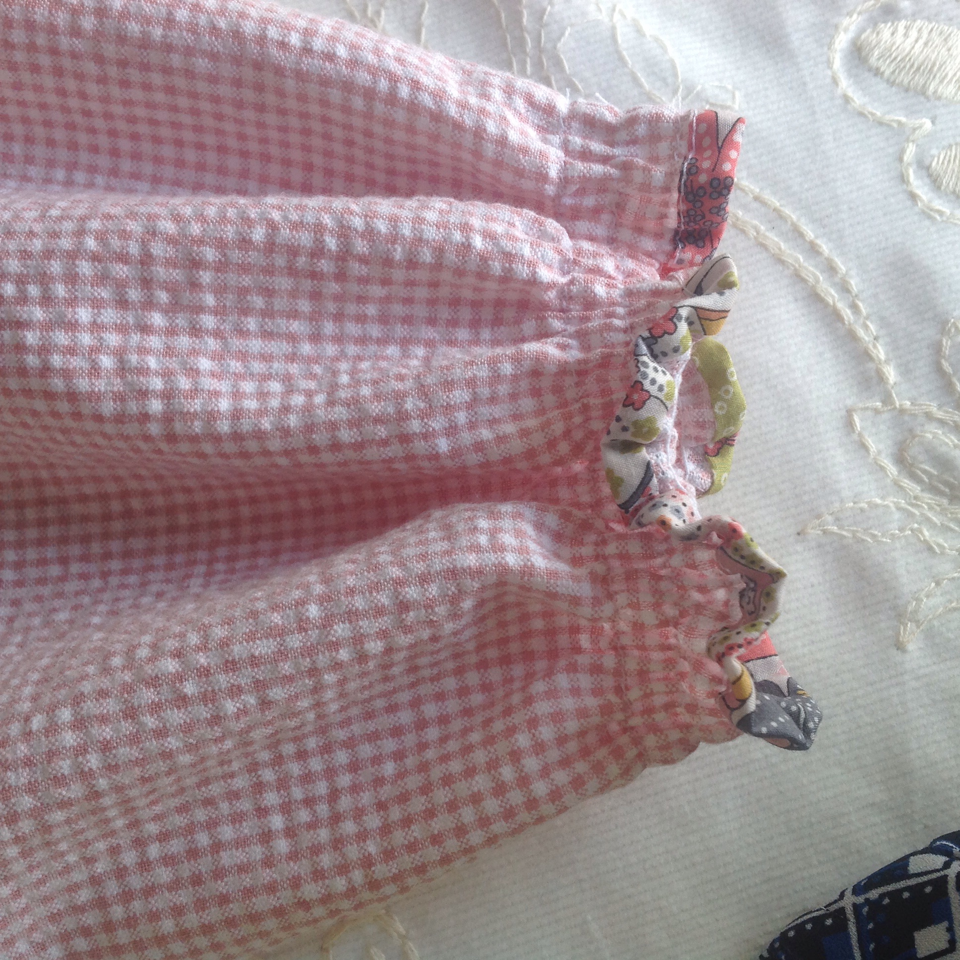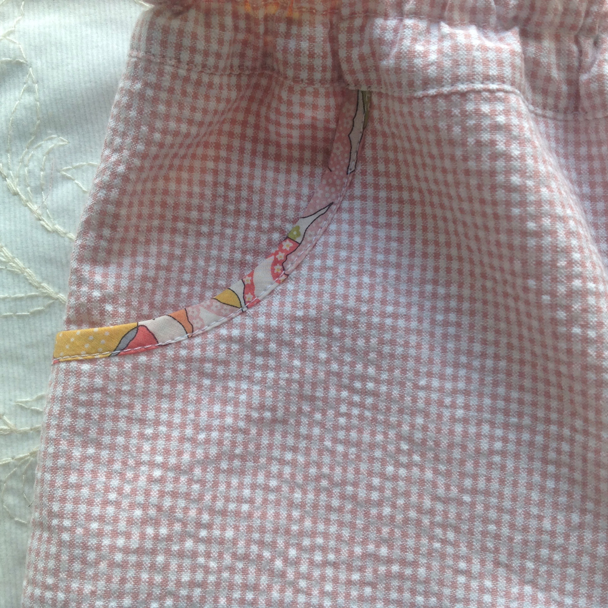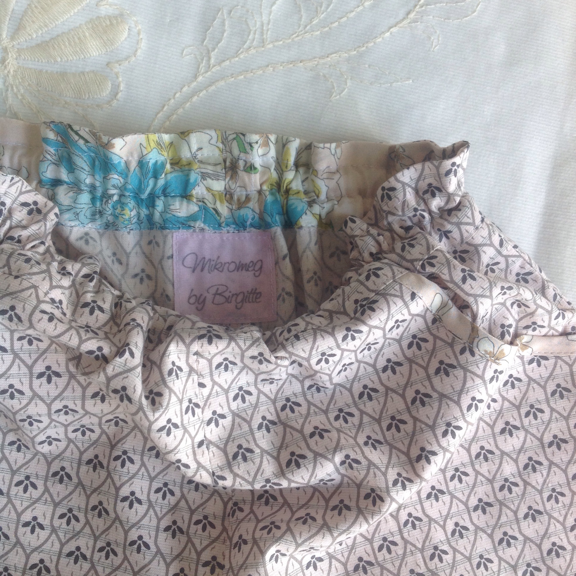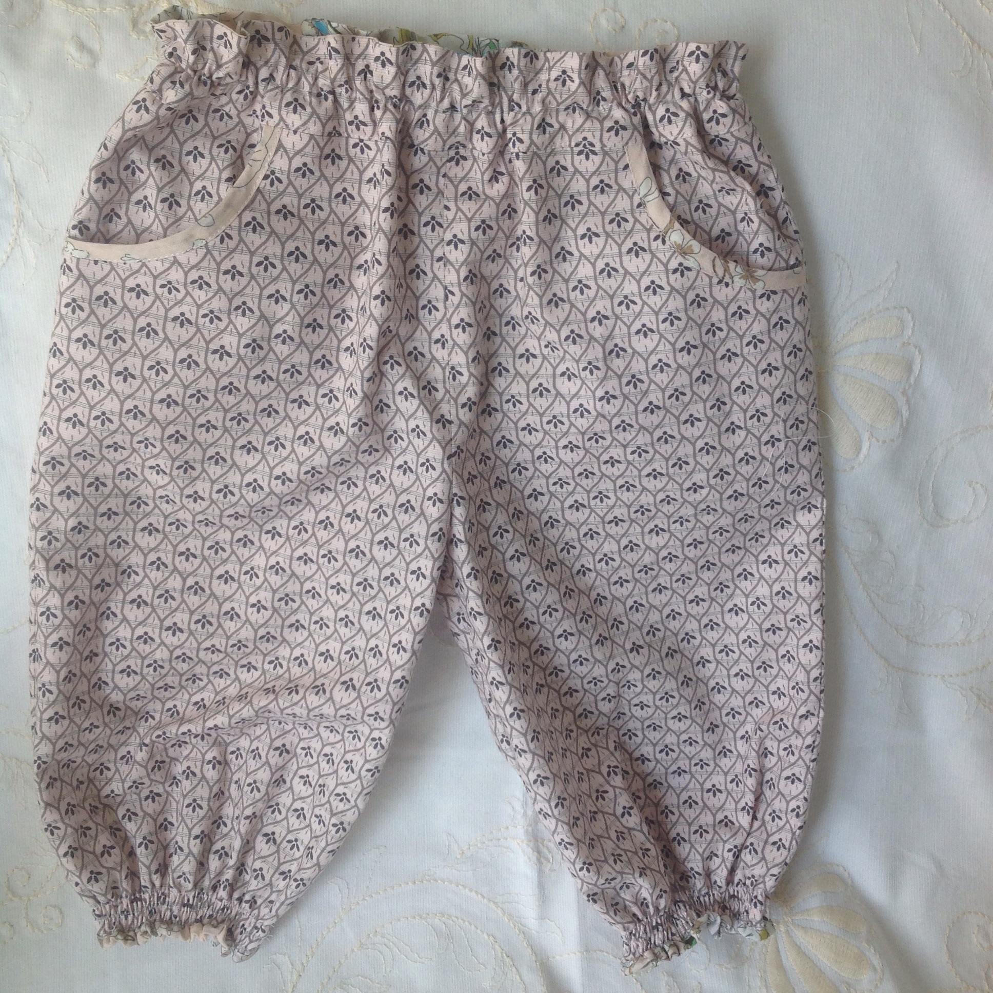 Den andre buksa i et lyst rosa bomullstoff med grå detaljer, beleggene i et blomstrende viscosestoff, begge kjøpt på Stoff og stil. Så da får vi håpe hun blir fornøyd.😊