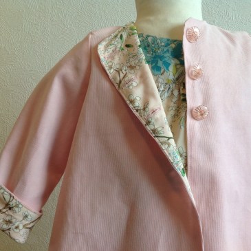 Denne gangen er det nok en liten prinsesse fra Flekkefjord som skal få seg kåpe. Denne gangen i rosa ullflanell. Kåpen har «prinsesssesnitt» med rikelig volang i skjørte-delen, knappene er trukket i samme stoff.
